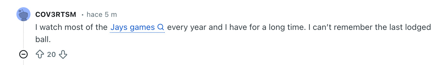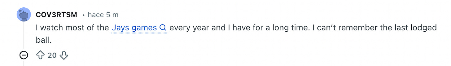 Solo gente en Reddit que asegura haber visto todos los partidos de la historia y que solo han visto algo como esto una o dos veces. Seguro son fans de los Blue Jays y están en tanta negación como yo.