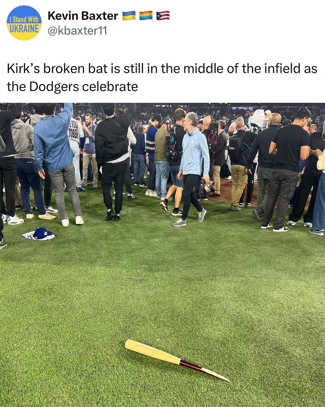 Después lo vimos. El bat partido a la mitad en el piso, y los Dodgers celebrando la victoria ante un Rogers Centre mudo.